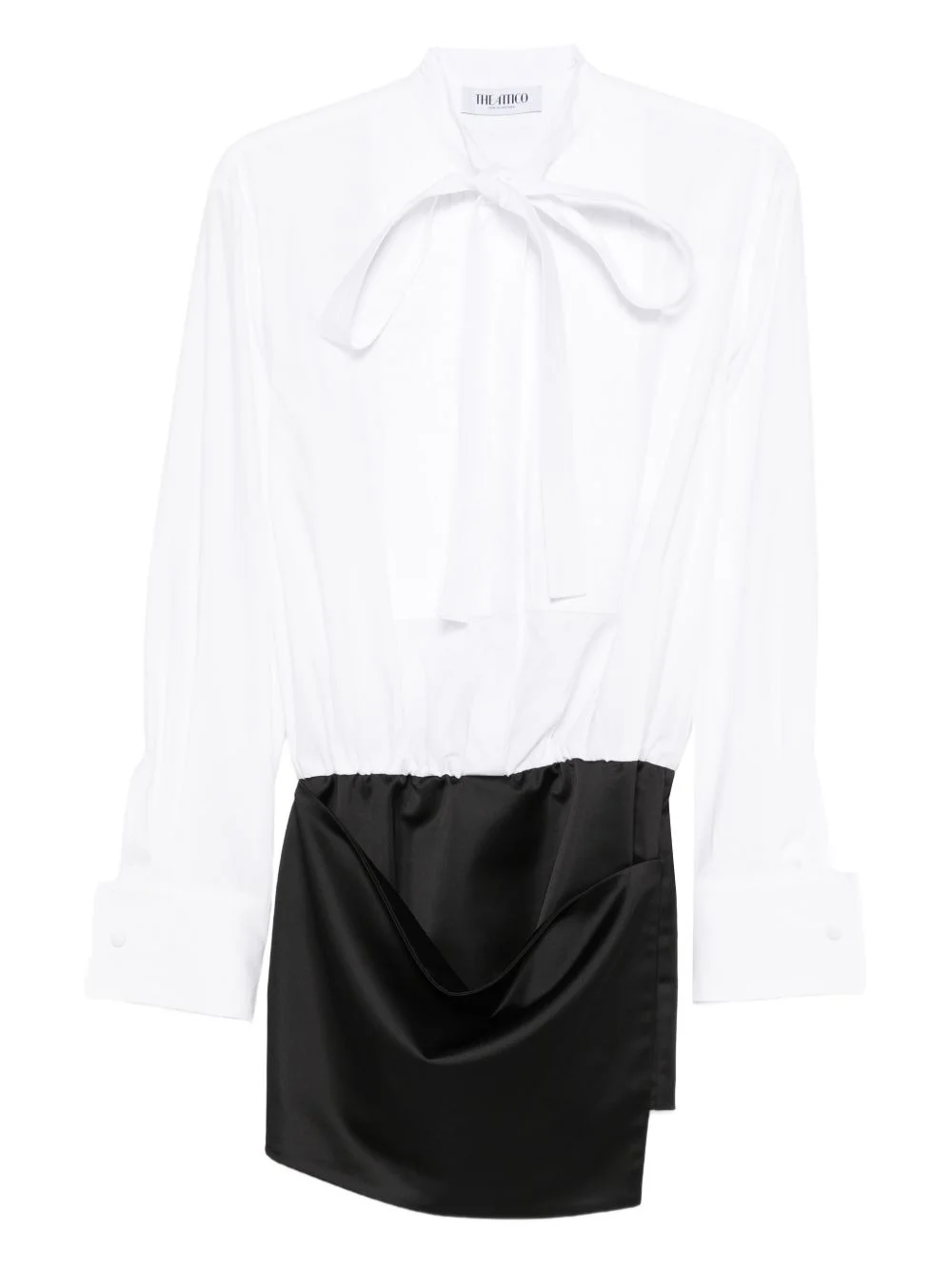 neck-tie mini dress Highlights - White and black - Neck-tie detail - Long sleeves - Cuff detailing Made in Italy Composition Outer: Cotton 100%, Polyester 97%, Spandex/Elastane 3% Lining: Viscose 52%, Acetate 48% SIZE & FIT Model measurements Height 5 ft 8 in(1.73 m) Bust/Chest 29.92 in(76 cm) Hips 33.07 in(84 cm) Waist 23.22 in(59 cm) Washing instructions Machine Wash