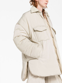 padded buttoned oversized coat Highlights - Sand beige - Cotton - Puffball design - Silver-tone logo plaque - Tonal stitching - Pointed flat collar - Concealed front press-stud fastening - Extra-long sleeves - Two chest flap pockets - Two side welt pockets - Straight hem Made in Italy Composition Lining: Polyester 100% Outer: Cotton 100%, Polyester 100% SIZE & FIT Model measurements Height 5 ft 10 in(1.77 m) Bust/Chest 27.95 in(71 cm) Hips 33.85 in(86 cm) Waist 23.22 in(59 cm) Measurement SLEEVE LENGTH 20.86 in(53 cm) LENGTH 30.7 in(78 cm) FittingInformation Designed to be unstructured, offering a loose fit throughout Made from a midweight non-stretch fabric This piece fits true to size – take your usual size