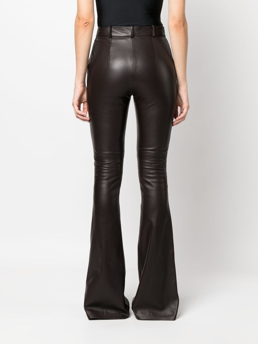 Piaf leather flared trousers In keeping with The Attico’s statement aesthetic, these Piaf trousers are an exaggerated take on classic flared styles from the ‘70s. They’re cut from supple brown leather to a high-rise silhouette. Highlights - Brown - Lambskin - High-waisted - Belt loops - Concealed front fastening - Full lining - Flared Imported Composition Lining: Cotton 100%, Cupro 100% Outer: Lamb Skin 100% SIZE & FIT Model measurements Height 5 ft 11 in(1.8 m) Bust/Chest 31.9 in(81 cm) Hips 35.8 in(91 cm) Waist 24.4 in(62 cm)