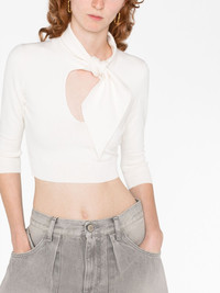 pussybow cut-out top This top from The Attico showcases the brand's softer side while still spotlighting its penchant for playful design details. It's knitted with a self-tie collar – which can be knotted into a bow – and keyhole cut-out at the front. Highlights - White - Knitted construction - Cut-out detailing - Pussy-bow collar - Three-quarter length sleeves - Straight hem - Cropped Made in Italy Composition Viscose 70%, Polyester 30% SIZE & FIT Model measurements Height 5 ft 10 in(1.77 m) Bust/Chest 27.95 in(71 cm) Hips 33.85 in(86 cm) Waist 23.22 in(59 cm) FittingInformation Designed for a close fit throughout Made with a lightweight knit, this piece offers some stretch This piece fits true to size – take your usual size