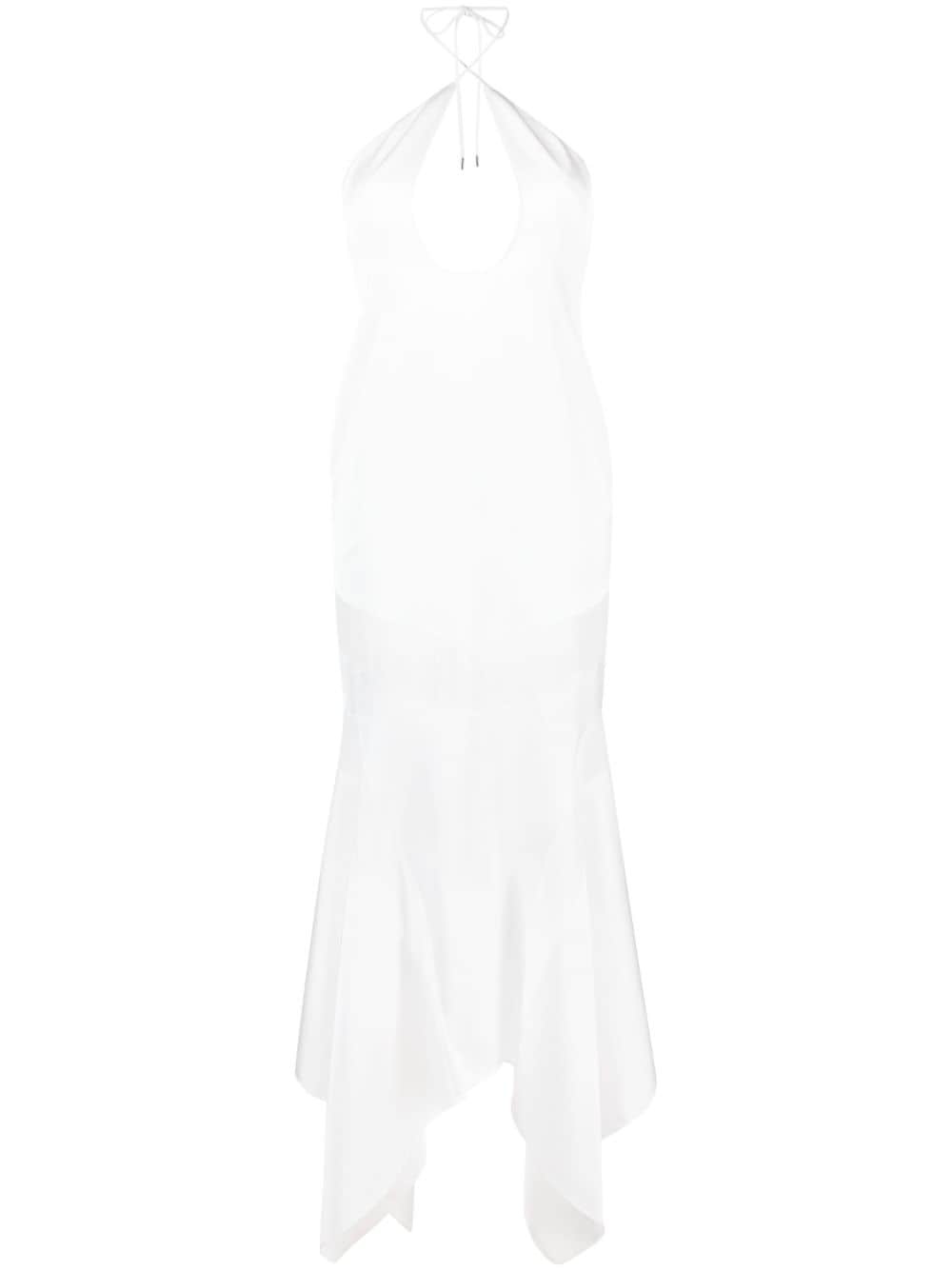 Saskia halterneck maxi dress The Attico's glamorous approach is showcased by this satin-finish maxi dress. Rendered in a timeless white, the dress is defined by an elegant halterneck silhouette that drapes delicately over the body to a flowing, asymmetric hem. Highlights - White - Satin finish - Halterneck tie fastening - Cut-out detailing - Open back - Panelled design - Asymmetric hem Made in Italy Composition Outer: Polyester 100% Lining: Polyester 100% SIZE & FIT Model measurements Height 5 ft 10 in(1.77 m) Bust/Chest 32.28 in(82 cm) Hips 35.03 in(89 cm) Waist 25.19 in(64 cm) FittingInformation Designed for a slim fit that sits just away from the body offering a close yet comfortable fit The adjustable tie waist gives a more adaptable and personalised fit Made from a lightweight non-stretch fabric, this piece offers minimal elasticity when worn This piece fits true to size – take your usual size Washing instructions Machine Wash