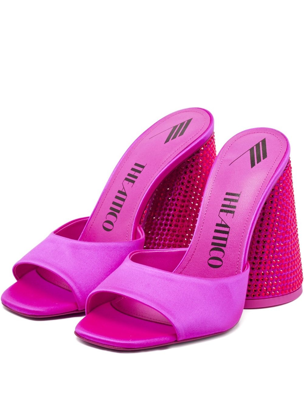 satin crystal heeled mules Highlights - Pink - Satin - High block heel - Crystal embellished heel - Open toe - Square toe - Condition: unworn. this item is previously owned but remains unworn and in its original condition. however, it does not come with its original tags. Made in Italy Composition Lining: Leather 100% Sole: Leather 100% Outer: Satin 100% SIZE & FIT Measurement HEEL 4.33 in(11 cm)