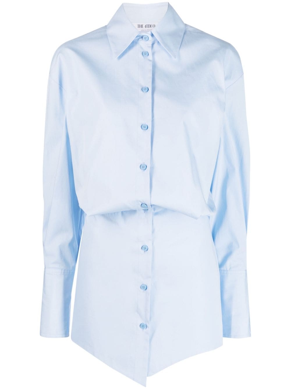 Silvye cotton minidress Crafted from crisp cotton poplin, this blue Silvye dress showcases The Attico's sharp take on classic shirting. It features exaggerated cuffs and a fitted waist that falls to an asymmetric V-shaped hem. Highlights - Light blue - Cotton - Poplin texture - Straight-point collar - Front button fastening - Drop shoulder - Long sleeves - Buttoned cuffs - Thigh-length - Asymmetric hem Made in Italy Composition Cotton 100% SIZE & FIT Model measurements Height 5 ft 10 in(1.79 m) Bust/Chest 31.49 in(80 cm) Hips 35.03 in(89 cm) Waist 23.62 in(60 cm) Measurement SLEEVE LENGTH 17.32 in(44 cm) LENGTH 35.82 in(91 cm) WAIST 32.28 in(82 cm) BUST 37.79 in(96 cm) FittingInformation Designed for a loose fit at the chest and waist with a close fit at the hips Made from a midweight non-stretch fabric This piece fits true to size – take your usual size Washing instructions Machine Wash