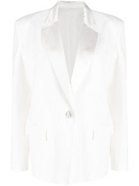 single-breasted blazer milk white virgin wool blend silk notched lapels front button fastening two front flap pockets long sleeves buttoned cuffs Made in Italy Composition Outer: Silk 100%, Virgin Wool 98%, Spandex/Elastane 2% Lining: Cupro 100% SIZE & FIT Model measurements Height 5 ft 10 in(1.79 m) Bust/Chest 31.1 in(79 cm) Hips 35.03 in(89 cm) Waist 24.01 in(61 cm) FittingInformation This piece fits true to size. We recommend you get your regular size Cut for a loose fit Made with a mid-weight fabric Washing instructions Dry Clean Only