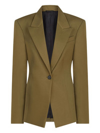 single-breasted blazer Highlights - Olive green - Single button fastening - Peak lapels - Padded shoulders - Long sleeves - Straight hem Made in Italy Composition Virgin Wool 100% Washing instructions Read Manufacturer Guidelines