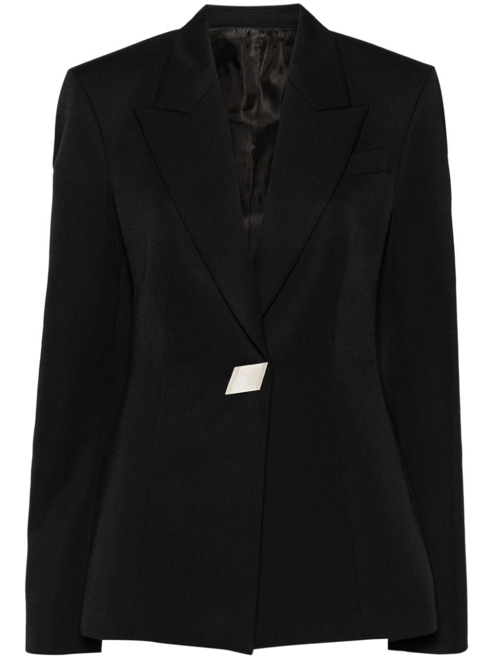 single-breasted virgin-wool blazer Highlights - Black - Virgin wool - Twill weave - Peak lapels - Shoulder pads - Long sleeves with faux buttoned cuffs - Chest welt pocket - Two side inset pockets - Central rear vent - Full lining - Straight hem - Front single button fastening Made in Italy Composition Lining: Viscose 100% Outer: Virgin Wool 100% SIZE & FIT Model measurements Height 5 ft 9 in(1.76 m) Bust/Chest 31.88 in(81 cm) Hips 35.43 in(90 cm) Waist 24.8 in(63 cm) FittingInformation Designed for a slim fit that sits just away from the body offering a close yet comfortable fit The internal shoulder pads offer a structured shape Made from a midweight non-stretch fabric This piece fits true to size – take your usual size
