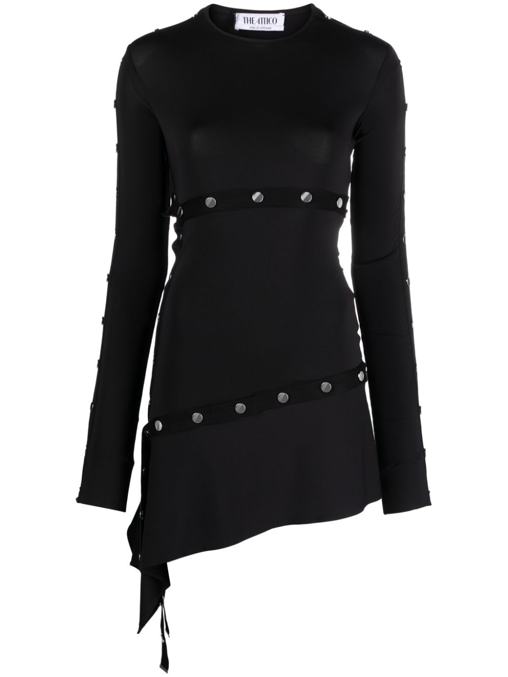 studded asymmetric convertible dress The Attico’s penchant for statement silhouettes is demonstrated with this asymmetric black minidress. It’s traced with functional silver-tone press studs that unfasten for custom styling. Highlights - Jet black - Stretch-jersey - Grosgrain ribbon trim - Press-stud placket - Detachable panels - Silver-tone hardware - Round neck - Long raglan sleeves - Above-knee length - Asymmetric hem Made in Italy Composition Acetate 75%, Polyamide 20%, Other fibres 5% SIZE & FIT Model measurements Height 5 ft 10 in(1.77 m) Bust/Chest 31.1 in(79 cm) Hips 34.64 in(88 cm) Waist 24.8 in(63 cm) FittingInformation Designed for a close fit throughout Made from a midweight fabric This piece fits true to size – take your usual size Washing instructions Hand Wash
