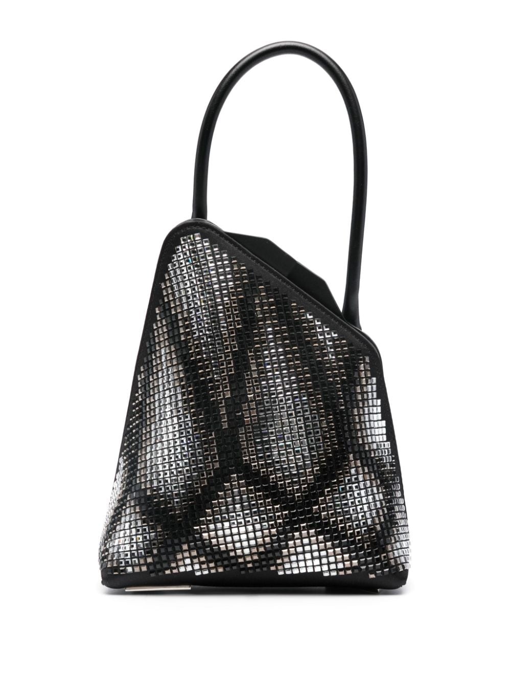 Sunset shoulder bag Highlights - Black - Calf leather - Asymmetric body - Satin finish - Tonal stitching - Panelled design - Ombre-effect crystal-embellished panel - Single rolled top handle - Main compartment - Internal patch pocket - Internal logo stamp - Faux-leather lining - Metal feet - Concealed magnetic fastening - This piece comes complete with a protective dust bag. Made in Italy Composition Outer: Polyester 100%, Calf Leather 100%, Silicone 100%, Metal 100% Lining: Polyurethane 51%, Cotton 29%, Polyester 20% SIZE & FIT Model measurements Height 5 ft 11 in(1.8 m) Bust/Chest 33.07 in(84 cm) Hips 37.4 in(95 cm) Waist 25.19 in(64 cm) Measurement DEPTH 2.75 in(7 cm) HANDLE 4.33 in(11 cm) HEIGHT 9.05 in(23 cm) WIDTH 7.48 in(19 cm)