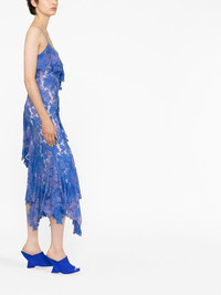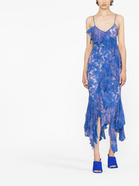 Thelma lace draped dress Crafted in Italy from floral lace and cut for an asymmetric silhouette, this violet-blue iteration of the Thelma dress falls into a draped calf-length whilst a V-neck and open back tap into The Attico's penchant for bold and celebratory pieces. Made in Italy Composition Outer: Cotton 52%, Viscose 25%, Polyester 23% Lining: Polyester 100% SIZE & FIT Model measurements Height 5 ft 10 in(1.78 m) Bust/Chest 30.7 in(78 cm) Hips 34.64 in(88 cm) Waist 23.22 in(59 cm) FittingInformation This piece fits true to size. We recommend you get your regular size Designed for a close fit at the bust, waist and hips Made with a mid-weight non-stretch fabric Washing instructions Hand Wash
