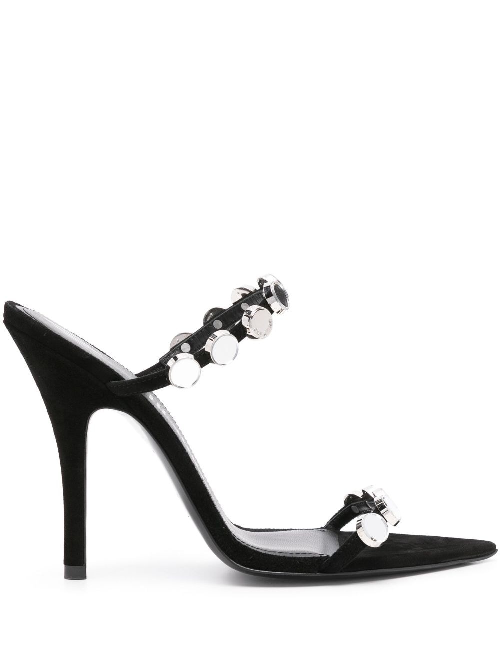 Venus 105mm suede sandals Highlights - Black - Calf suede - Mirror detailing - Pointed open toe - Double-strap design - Branded leather footbed - 105mm high heel - Leather outsole - Slip-on style Made in Italy Composition Suede 100% SIZE & FIT Measurement HEEL 4.52 in(11.5 cm) Sole height 0.39 in(1 cm)