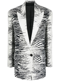 zebra-print single-breasted blazer The Attico plays with proportions for its SS23 collection, giving classic styles an overtly contemporary feel. This blazer is tailored to an oversized fit that's enlivened with bold zebra stripes throughout. Made in Italy Composition Outer: Cotton 49%, Viscose 34%, Polyamide 14%, Polyester 3% Lining: Cupro 100% SIZE & FIT Model measurements Height 5 ft 10 in(1.77 m) Bust/Chest 32.28 in(82 cm) Hips 35.03 in(89 cm) Waist 25.19 in(64 cm) Measurement SLEEVE LENGTH 24.8 in(63 cm) LENGTH 32.28 in(82 cm) FittingInformation This piece fits true to size. We recommend you get your regular size Cut for a loose fit Made with a mid-weight non-stretch fabric Washing instructions Dry Clean Only