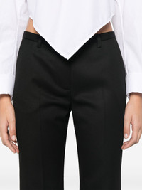 flared trousers Highlights - Black - Twill weave - Concealed front button, hook and zip fastening - Belt loops - Pressed crease - Two diagonal pockets to the sides - Two rear button-fastening pockets - Flared design Imported Composition Outer: Viscose 66%, Polyester 24%, Wool 10% Lining: Polyester 100% SIZE & FIT Model measurements Height 5 ft 10 in(1.78 m) Bust/Chest 33.85 in(86 cm) Hips 36.61 in(93 cm) Waist 26.77 in(68 cm) Measurement INSIDE LEG 33.46 in(85 cm) FRONT RISE 10.62 in(27 cm) WAIST 33.85 in(86 cm) HIPS 39.37 in(100 cm) FittingInformation Designed with a flared hem, these trousers allow for a close fit at the waist with a slim fit over the leg and widening towards the hem Made from a midweight non-stretch fabric