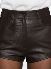 Loen leather pocket shorts Highlights - Dark brown - Leather construction - Button fly Imported Composition Lining: Polyester 100% Outer: Lamb Skin 100% SIZE & FIT Model measurements Height 5 ft 11 in(1.8 m) Bust/Chest 32.67 in(83 cm) Hips 36.22 in(92 cm) Waist 24.4 in(62 cm) Washing instructions Specialist Cleaning