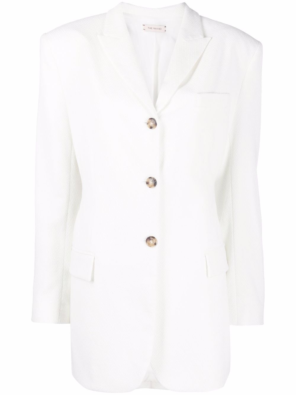 Edynburg blazer jacket white cotton blend peak lapels chest welt pocket front button fastening long sleeves two front flap pockets belted waist straight hem side slits Imported Composition Outer: Leather 100%, Cotton 82%, Polyamide 16%, Spandex/Elastane 2% Lining: Viscose 55%, Polyamide 35%, Silk 10% SIZE & FIT Model measurements Height 5 ft 10 in(1.78 m) Bust/Chest 31.88 in(81 cm) Hips 34.64 in(88 cm) Waist 24.01 in(61 cm) FittingInformation This piece fits true to size. We recommend you get your regular size Cut for a slim fit Made with a mid-weight fabric Washing instructions Dry Clean Only