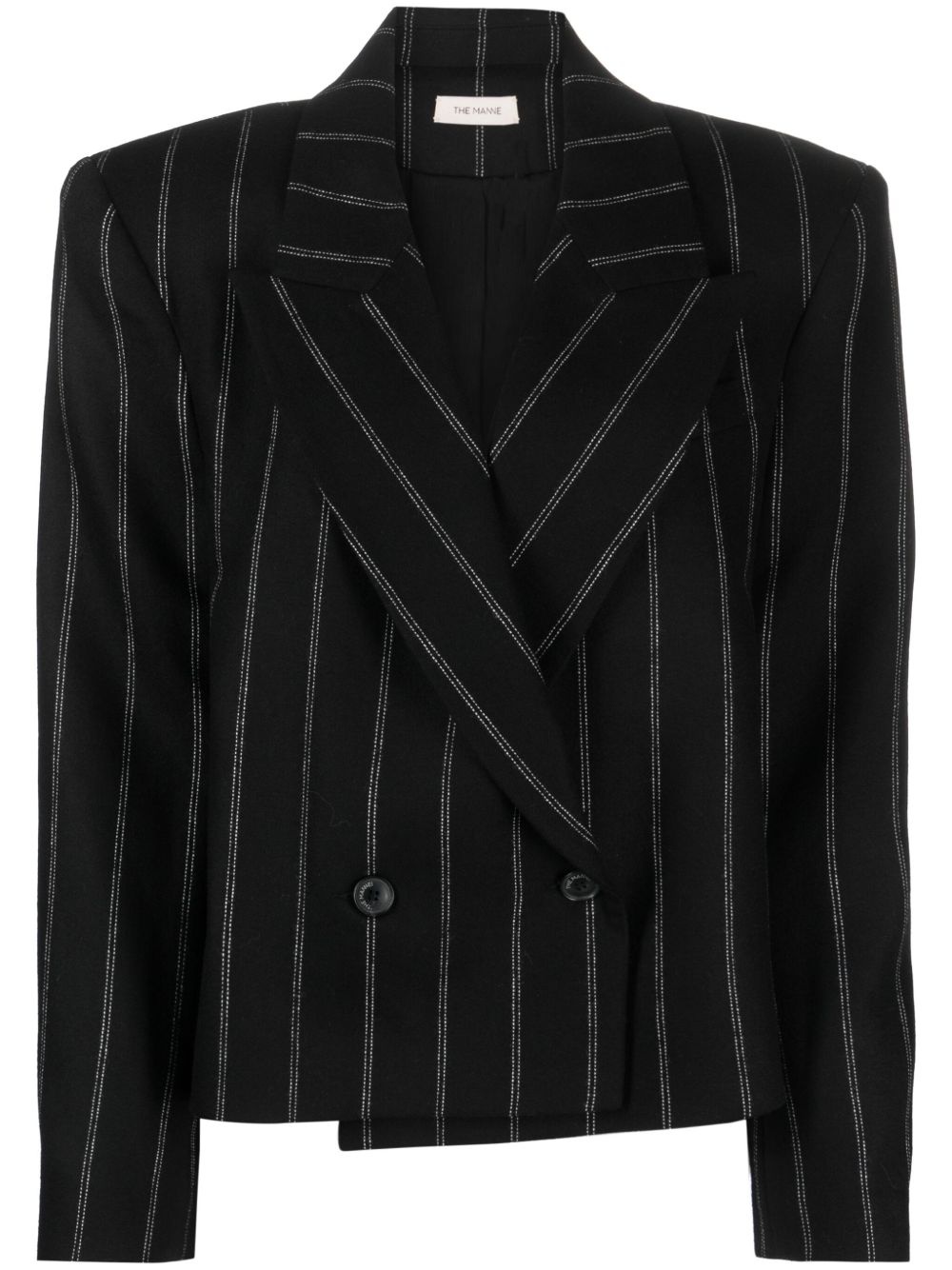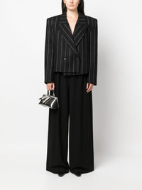 striped double-breasted wool blazer Highlights - Black/white - Virgin wool - Vertical stripe pattern - Peak lapels - Double-breasted button fastening - Shoulder pads - Long sleeves - Straight hem Imported Composition Outer: Virgin Wool 100% Lining: Viscose 65%, Polyamide 35% SIZE & FIT Model measurements Height 5 ft 10 in(1.78 m) Bust/Chest 31.49 in(80 cm) Hips 36.22 in(92 cm) Waist 25.59 in(65 cm) Measurement CHEST 42.51 in(108 cm) SLEEVE LENGTH 25.59 in(65 cm) LENGTH 24.4 in(62 cm) FittingInformation Designed for a boxy fit, intended for a loose fit throughout The internal shoulder pads offer a structured shape Made from a midweight non-stretch fabric This piece fits true to size – take your usual size