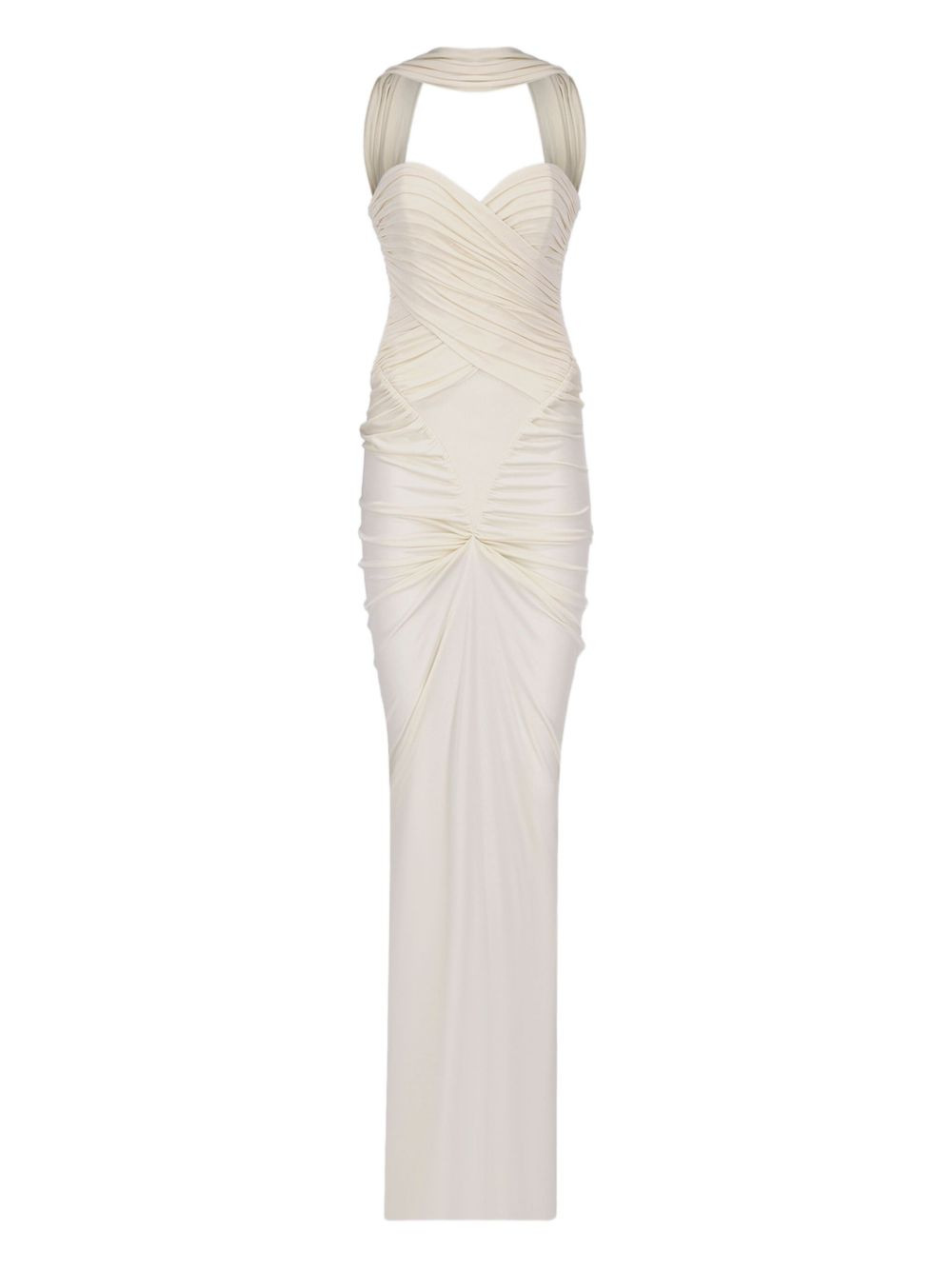 Samsara dress Highlights - Light beige - Concealed rear zip fastening - Draped detailing - Halterneck - Fitted waistline Imported Composition Polyester 100% Washing instructions Dry Clean Only