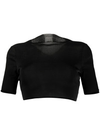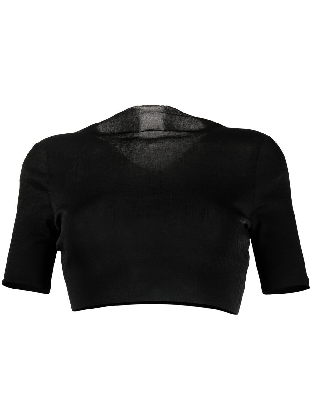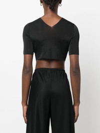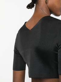 cropped short-sleeve top jet black V-neck short sleeves cropped Made in Italy Composition Polyester 100% SIZE & FIT Model measurements Height 5 ft 10 in(1.77 m) Bust/Chest 29.92 in(76 cm) Hips 34.25 in(87 cm) Waist 23.62 in(60 cm) FittingInformation This piece fits true to size. We recommend you get your regular size Cut for a close fit Made with a lightweight fabric Washing instructions Hand Wash