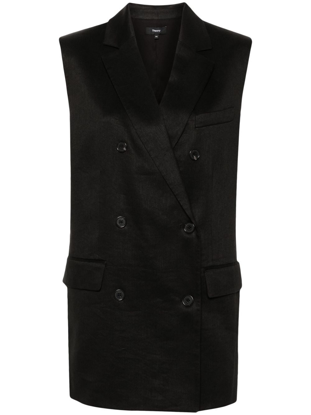 double-breasted linen blend gilet Highlights - Black - Linen blend - Notched lapels - Shoulder pads - Sleeveless - Chest welt pocket - Two front flap pockets - Full lining - Double-breasted button fastening Imported Composition Outer: Linen/Flax 52%, Viscose 45%, Elastane 3% Lining: Viscose 100% SIZE & FIT Model measurements Height 5 ft 11 in(1.8 m) Bust/Chest 31.49 in(80 cm) Hips 36.61 in(93 cm) Waist 24.4 in(62 cm) FittingInformation Designed to be unstructured, offering a loose fit throughout Made from a midweight fabric This piece fits true to size – take your usual size