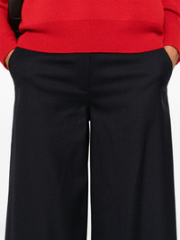 wide-leg trousers Highlights - Navy blue - Flannel - Concealed fly and button fastening - Belt loops - Mid-rise - Two side slit pockets - Two rear welt pockets - Palazzo design - Wide leg Imported Composition Wool 40%, Polyester 29%, Viscose 28%, Spandex/Elastane 3% SIZE & FIT Model measurements Height 5 ft 11 in(1.8 m) Bust/Chest 33.07 in(84 cm) Hips 37.4 in(95 cm) Waist 25.19 in(64 cm) FittingInformation Designed with a wide-leg cut, these trousers allow for a close fit at the waist and offer a loose and roomy fit over the leg Made from a midweight stretch fabric, this piece offers elasticity and flexibility when worn Washing instructions Dry Clean Only