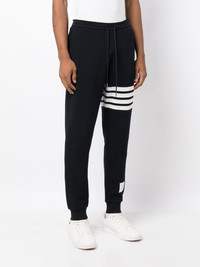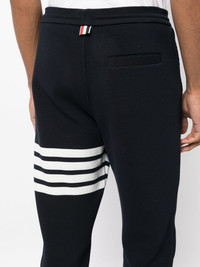 4-Bar cotton track pants Embracing a casual design, these track pants by Thom Browne are crafted from pure cotton and fastened with an elasticated drawstring waistband. Imagined in dark blue, the pair gains a branding touch with the 4-Bar stripes on the left leg. Highlights - Midnight blue/white - Cotton - Signature 4-bar stripe - Elasticated drawstring waistband - Two side slit pockets - Rear welt pocket - Rwb stripe - Ribbed ankles Made in Italy Composition Cotton 100% SIZE & FIT Model measurements Height 6 ft 3 in(1.9 m) Bust/Chest 35.03 in(89 cm) Hips 36.61 in(93 cm) Waist 29.13 in(74 cm) FittingInformation Designed for a relaxed tapered leg, allowing a comfortable loose fit above the knee with a closer fit towards the calves Adjust this piece’s waistband to your preference using the drawstring Made from a midweight non-stretch fabric, this piece offers minimal elasticity when worn This piece fits true to size – take your usual size Washing instructions Machine Wash