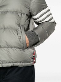 4-Bar bomber jacket Bundle up, Thom Browne style. This quilted jacket is inspired by classic bomber jackets and is detailed with the signature 4-Bar stripe on the sleeve. Keep cosy in style. Highlights - Medium grey - Signature 4-bar stripe - Quilted - Front press stud fastening - Long sleeves - Two side slit pockets - Ribbed edge Made in Italy Composition Lining: Feather Down 100%, Polyester 100% Outer: Nylon 100%, Merino 90%, Polyamide 8%, Spandex/Elastane 2% SIZE & FIT Model measurements Height 6 ft 2 in(1.87 m) Bust/Chest 36.41 in(92.5 cm) Hips 35.43 in(90 cm) Waist 29.52 in(75 cm) FittingInformation Designed for a relaxed fit, this piece allows for comfort and movement when worn The internal drawstring at the hem allows for fitted preferences Made from a padded non-stretch fabric, giving it no natural elasticity This piece fits true to size – take your usual size Washing instructions Dry Clean Only