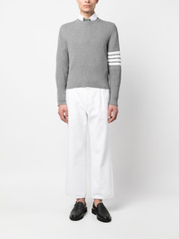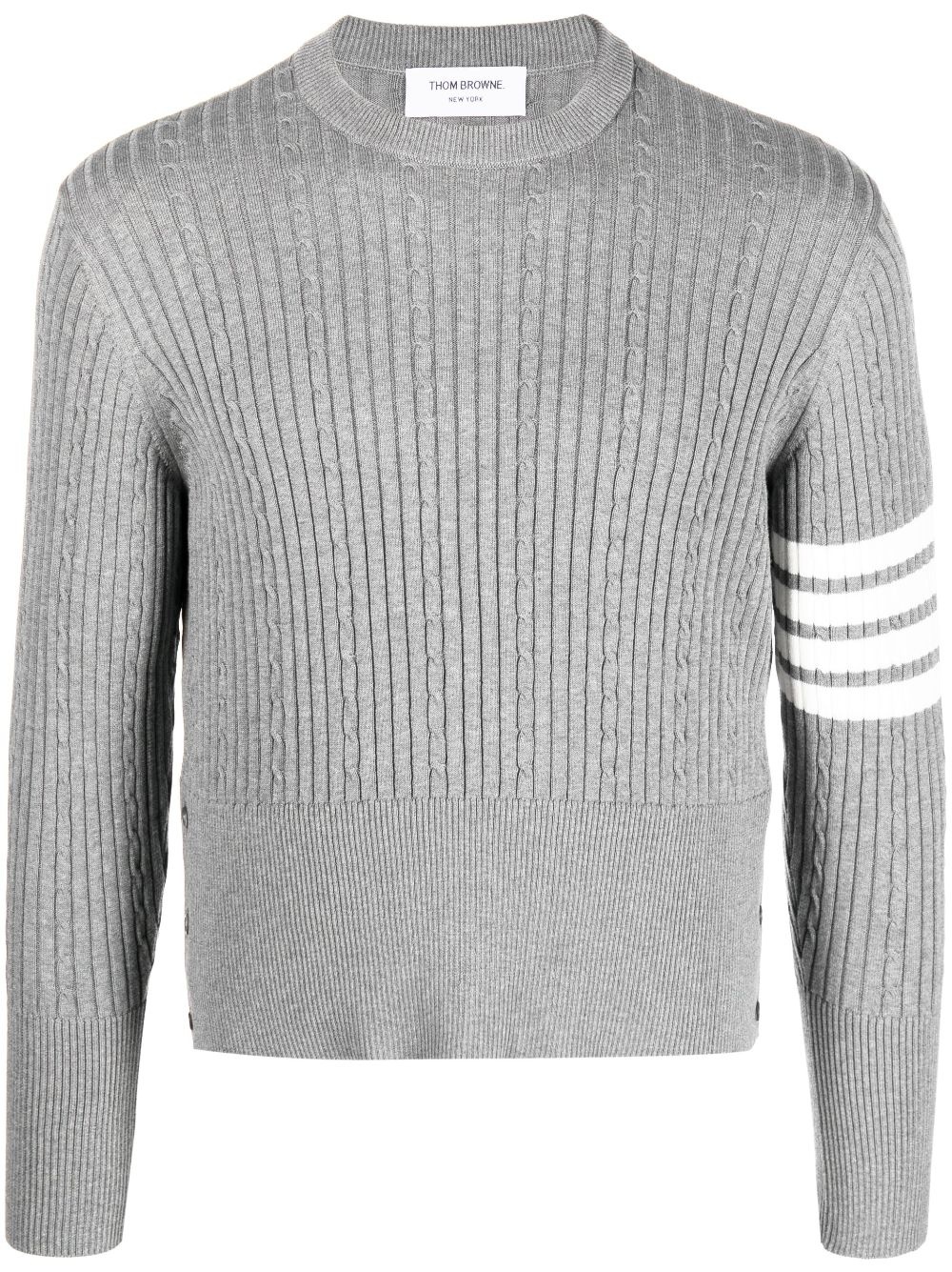 4-Bar cable-knit ribbed jumper Thom Browne is renowned for creating smart wardrobe staples with a preppy twist. This approach is evident in this ribbed jumper, presented in the brand's signature grey hue made instantly recognisable thanks to the 4-Bar stripe at the sleeve. Highlights - Grey - Cotton - Ribbed knit - Signature 4-bar stripe - Rwb stripe - Round neck - Long sleeves - Buttoned cuffs - Ribbed edge Made in Italy Composition Cotton 100% SIZE & FIT Model measurements Height 6 ft 1 in(1.85 m) Bust/Chest 35.82 in(91 cm) Hips 37.79 in(96 cm) Waist 29.13 in(74 cm) FittingInformation Designed for a slim fit, offering a comfortable fit that sits just away from the body Made with a midweight knit, this piece offers some stretch This piece fits small – take one size up Measurement CHEST 35.43 in(90 cm) LENGTH 22.83 in(58 cm) SLEEVE LENGTH 22.83 in(58 cm) Washing instructions Dry Clean Only