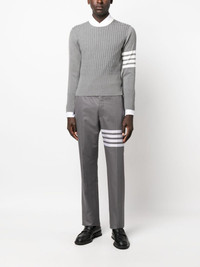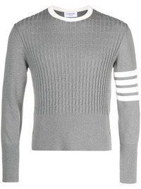4-Bar cable-knit sweatshirt Thom Browne is renowned for creating smart wardrobe staples with a preppy twist. This approach is evident in this cable-knit sweatshirt, presented in the brand's signature grey hue made instantly recognisable thanks to the 4-Bar stripe at the sleeve. Highlights - Grey - Cotton - Cable knit - Signature 4-bar stripe - Contrasting neckline - Crew neck - Signature grosgrain loop tab - Rwb stripe - Long sleeves - Buttoned cuffs - Straight hem Made in Italy Composition Outer: Cotton 100% SIZE & FIT Model measurements Height 6 ft 2 in(1.87 m) Bust/Chest 36.41 in(92.5 cm) Hips 37 in(94 cm) Waist 29.52 in(75 cm) FittingInformation Designed for a slim fit, offering a comfortable fit that sits just away from the body Made with a midweight knit, this piece offers some stretch This piece fits true to size – take your usual size