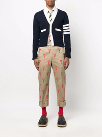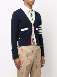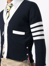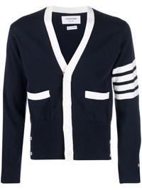 4-Bar cashmere cardigan Mirroring the clean lines and signature house codes of the American brand, this cashmere cardigan is presented as part of Thom Browne's AW22 collection. Detailed with the house's 4-Bar motif, the knitted style brings fashion knowledge to the scene. Made in United Kingdom Composition Cashmere 100% SIZE & FIT Model measurements Height 6 ft 1 in(1.85 m) Bust/Chest 38.58 in(98 cm) Hips 37 in(94 cm) Waist 30.31 in(77 cm) FittingInformation This piece fits true to size. We recommend you get your regular size Cut for a slim fit Made with a mid-weight fabric