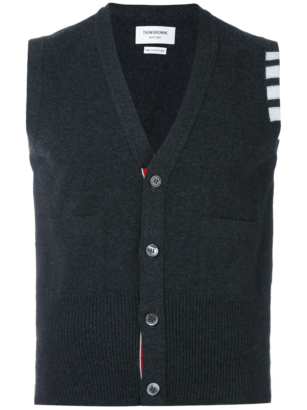 4-Bar Cashmere Cardigan Vest Grey cashmere 4-Bar Cashmere Cardigan Vest from Thom Browne. Made in United Kingdom Composition Outer: Cashmere 100% SIZE & FIT Model measurements Height 6 ft 2 in(1.87 m) Bust/Chest 37.79 in(96 cm) Hips 37.79 in(96 cm) Waist 30.31 in(77 cm) Washing instructions Dry Clean Only