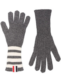 4-Bar cashmere gloves Thom Browne's gloves are spun from cashmere for a combination of warmth and softness. Thisgrey pair is trimmed with the brand's signature RWB striped and the iconic 4-Bar stripe, for instant recognition. Made in Italy Composition Cashmere 100% SIZE & FIT Model measurements Height 6 ft 1 in(1.85 m) Bust/Chest 34.25 in(87 cm) Hips 33.85 in(86 cm) Waist 25.98 in(66 cm) Washing instructions Dry Clean Only