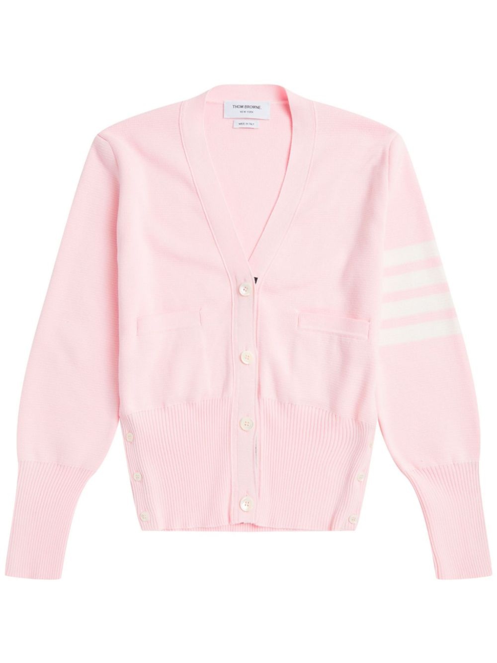 4-Bar stripe cotton cardigan Thom Browne transforms the classic cardigan silhouette by adding branding details that need no introduction. Crafted from light-pink cotton with a fine-knitted construction, it's decorated with the hallmark 4-Bar stripe at the left sleeve and the signature grosgrain loop tab at the rear. Highlights - Light pink - Cotton - Fine knit - Signature 4-bar stripe - Signature grosgrain loop tab - Rwb stripe - V-neck - Front button fastening - Long sleeves - Buttoned cuffs - Two front patch pockets - Ribbed cuffs and hem Made in Italy Composition Cotton 100% SIZE & FIT Model measurements Height 5 ft 9 in(1.75 m) Bust/Chest 32.67 in(83 cm) Hips 36.22 in(92 cm) Waist 24.8 in(63 cm) Measurement BUST 33.85 in(86 cm) LENGTH 23.22 in(59 cm) WAIST 27.55 in(70 cm) SLEEVE LENGTH 18.5 in(47 cm) Shoulder Width 14.96 in(38 cm) FittingInformation This piece fits true to size. We recommend you get your regular size Cut for a relaxed fit Made with a mid-weight fabric Washing instructions Dry Clean Only