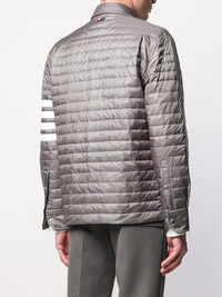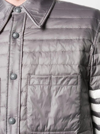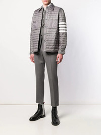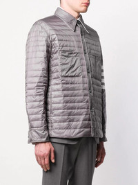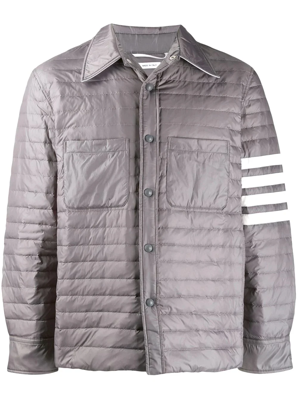 4-Bar down fill shirt jacket Combining highest-quality fabrics and a conservative sensibility with a touch of irreverence and humour, this medium grey down fill 4-Bar shirt jacket from Thom Browne is a classic. Featuring a classic collar, long sleeves, two chest pockets and a press stud fastening. Made in Italy Composition Polyamide 50%, Goose Down 40%, Feather 10% SIZE & FIT FittingInformation Designed to be unstructured, offering a loose fit throughout Made from a padded non-stretch fabric, giving it no natural elasticity This piece fits true to size – take your usual size Washing instructions Dry Clean Only