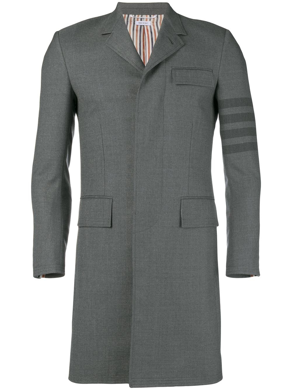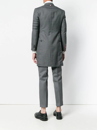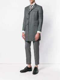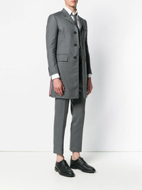4-Bar high-armhole Chesterfield coat We will be wearing this grey wool 4-Bar Chesterfield coat from Thom Browne on our weekly visits to her Majesty, the Queen, trying to impress her as much as we can. Yes, we're obviously referring to our grandmother. But she is the Queen of our family, so... Featuring a spread collar, a chest pocket, a concealed front fastening, front flap pockets, long sleeves, button cuffs, a double vent to the rear and a signature 4-Bar detail to the left arm. Imported Composition Polyester 50%, Wool 50% SIZE & FIT Model measurements Height 6 ft 2 in(1.87 m) Bust/Chest 33.85 in(86 cm) Hips 35.82 in(91 cm) Waist 29.52 in(75 cm) Measurement CHEST 39.37 in(100 cm) SLEEVE LENGTH 24.01 in(61 cm) WAIST 39.37 in(100 cm) Washing instructions Dry Clean Only