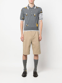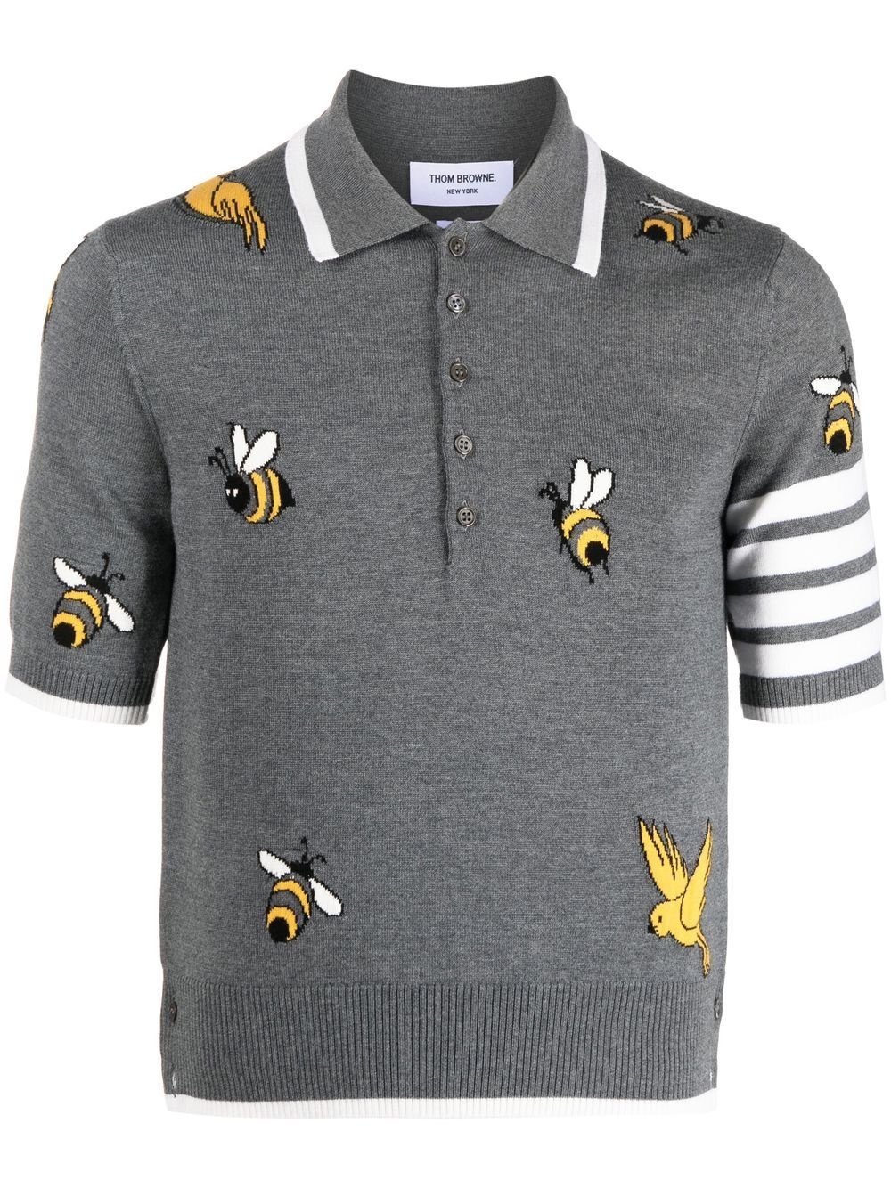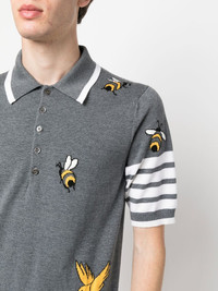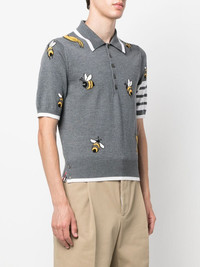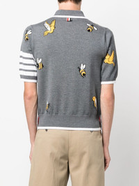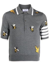 4-Bar intarsia-knit polo shirt Since 2001, New York-based designer Thom Browne has radically changed the world of tailoring. Looking at each design with a contemporary edge, this polo shirt from the SS23 collection is finished with the label's signature 4-Bar logo along the sleeve for added charm complemented with birds and bees intarsia motifs. Made in Italy Composition Wool 90%, Cotton 10% SIZE & FIT Model measurements Height 6 ft 2 in(1.87 m) Bust/Chest 35.82 in(91 cm) Hips 35.43 in(90 cm) Waist 27.95 in(71 cm) FittingInformation Designed for a slim fit, offering a comfortable fit that sits just away from the body Made from a midweight non-stretch fabric, this piece offers minimal elasticity when worn This piece fits true to size – take your usual size Washing instructions Dry Clean Only