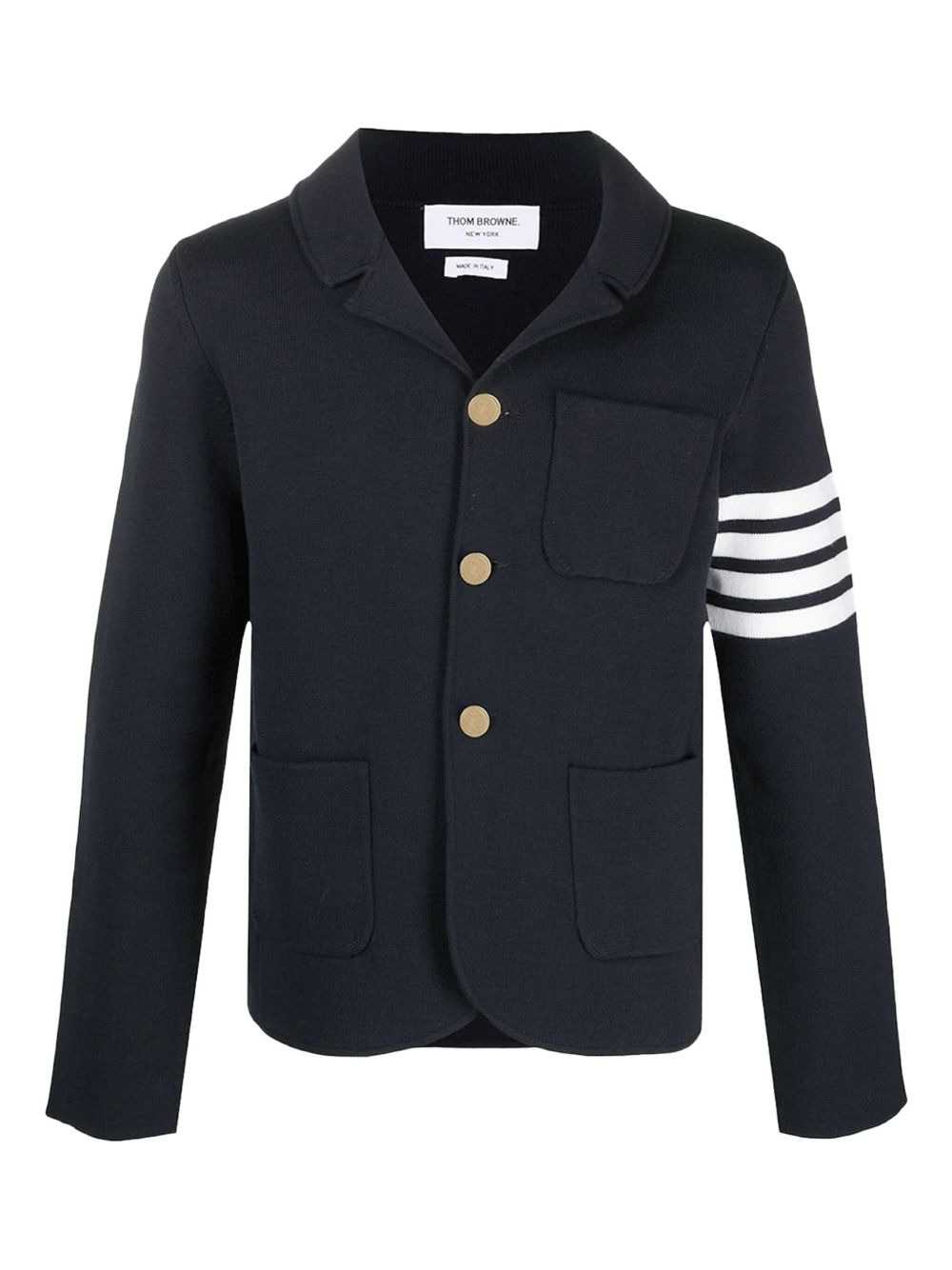 4-Bar knit blazer Nothing like knitwear. With a signature 4-Bar motif and a navy blue hue, this blazer from Thom Browne is nothing short of classic. What are you waiting for? Highlights - Navy blue - Wool-blend - Signature 4-bar stripe - Notched lapels - Front button fastening - Long sleeves - Buttoned cuffs Made in Italy Composition Wool 99%, Polyamide 1% SIZE & FIT FittingInformation Designed for a slim fit, offering a comfortable fit that sits just away from the body Made with a midweight knit, this piece offers some stretch This piece fits true to size – take your usual size Measurement CHEST 42 in(106.7 cm) SLEEVE LENGTH 25.98 in(66 cm) LENGTH 25.51 in(64.8 cm) WAIST 42 in(106.7 cm) Washing instructions Dry Clean Only