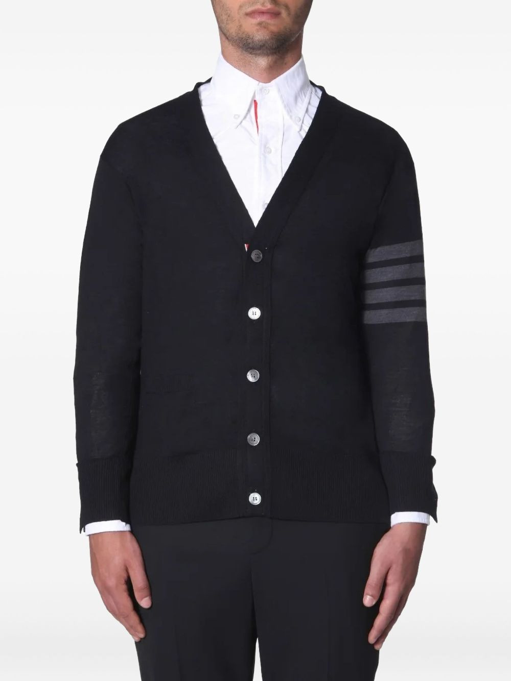 4-Bar knitted cardigan Those 4-Bar stripes on the sleeve show this is the making of Thom Browne. This cardigan has been knitted from navy-blue wool and detailed with a V-neck. Highlights - Navy blue/off white - Wool - Signature 4-bar stripe - V-neck - Front button fastening - Long sleeves - Straight hem Made in Italy Composition Wool 100% SIZE & FIT Measurement CHEST 37 in(94 cm) LENGTH 23.62 in(60 cm) SLEEVE LENGTH 22.83 in(58 cm) Washing instructions Dry Clean Only