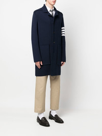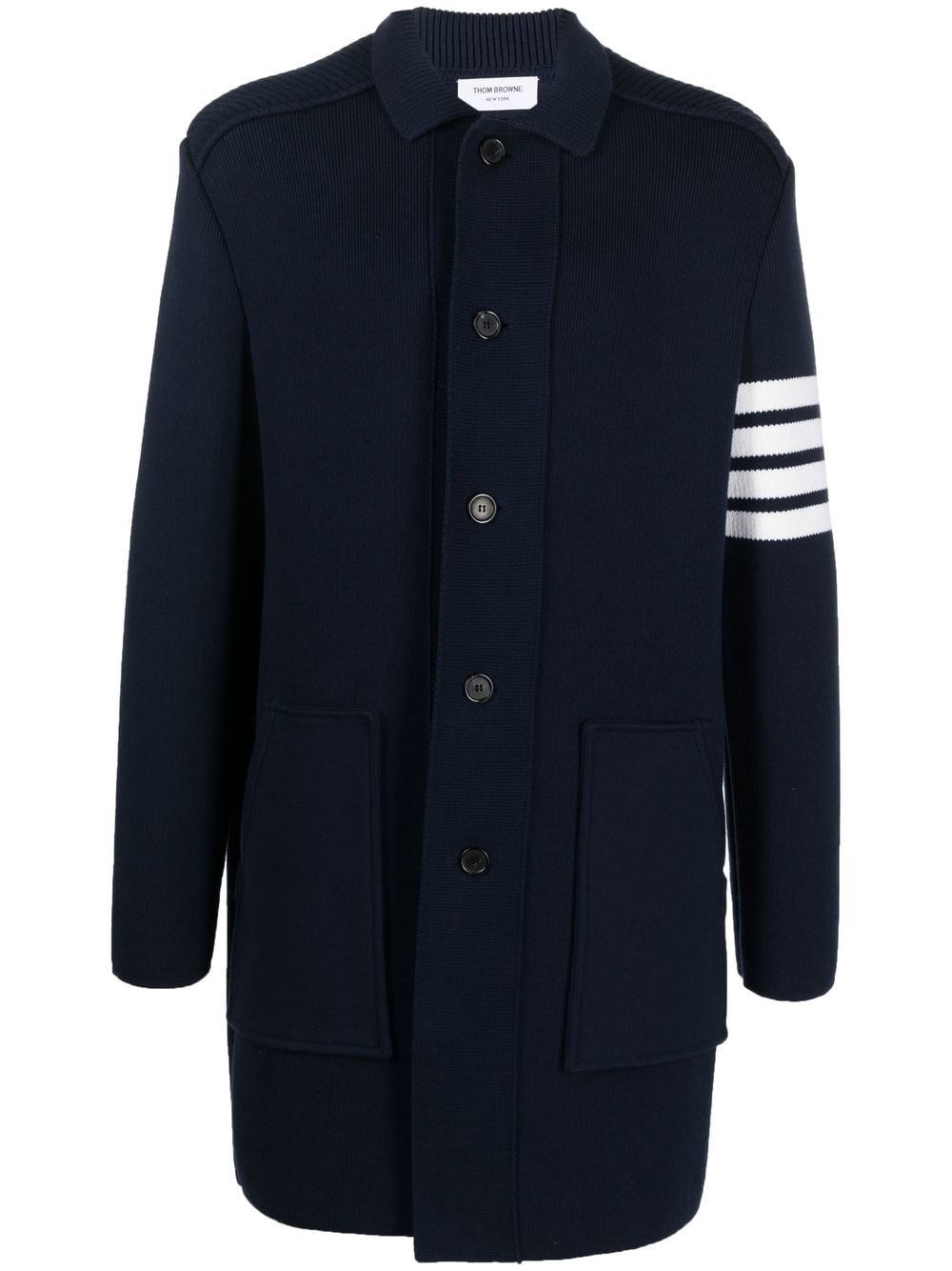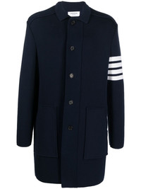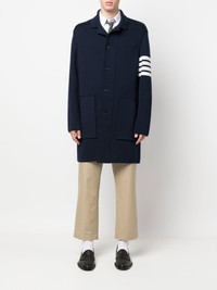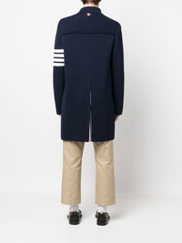 4-Bar knitted longline cardigan Creating a modern uniform is key for Thom Browne, by updating classic silhouettes in contemporary ways. Here, the brand takes cues from traditional outerwear tailoring to create a longline cardigan. The knitted piece features a buttoned closure and notched lapels, and is finished with a signature 4-Bar stripe on the sleeve. Made in Italy Composition Cotton 82%, Cashmere 14%, Polyamide 4% SIZE & FIT Model measurements Height 6 ft 2 in(1.87 m) Bust/Chest 35.82 in(91 cm) Hips 35.43 in(90 cm) Waist 27.95 in(71 cm) FittingInformation This piece fits true to size. We recommend you get your regular size Cut for a loose fit Made with a mid-weight fabric Washing instructions Dry Clean Only