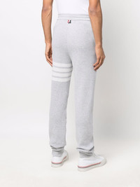 4-Bar knitted track pants Mirroring the clean lines and signature house codes of the American brand, these wool-cashmere track pants are presented as part of Thom Browne's AW22 collection. Detailed with the house's 4-Bar motif, the ash-grey pair brings fashion knowledge to the scene. Made in Italy Composition Cashmere 50%, Wool 50% SIZE & FIT Model measurements Height 6 ft 2 in(1.87 m) Bust/Chest 38.18 in(97 cm) Hips 36.61 in(93 cm) Waist 29.13 in(74 cm) FittingInformation This piece fits true to size. We recommend you get your regular size Designed to be loose over the leg with a fitted waist and hem Made with a mid-weight fabric Measurement FRONT RISE 12.79 in(32.5 cm) INSIDE LEG 27.55 in(70 cm) HIPS 37 in(94 cm)