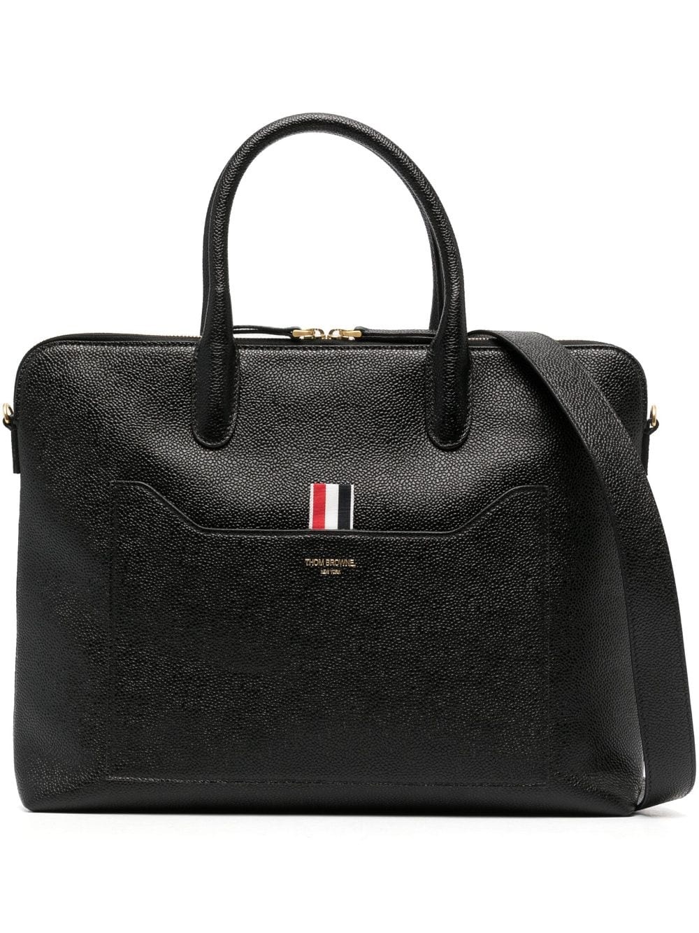 4-Bar leather briefcase Crafted from pebble leather, this briefcase by Thom Browne is rendered in black and features a sleek silhouette accented with the brand's recognisable RWB grosgrain tab. Besides a front slip pocket, it benefits from a spacious main compartment and comes with a detachable shoulder strap.  Highlights - Black - Calf leather - Pebbled texture - Logo stamp to the front - Slip pocket to the front - Signature grosgrain loop tab - Rwb stripe - Rwb stripe lining - Main compartment - Two top handles - Adjustable detachable shoulder strap Made in Italy Composition Lining: Polyester 100% Outer: Calf Leather 100% SIZE & FIT Model measurements Height 6 ft 2 in(1.87 m) Bust/Chest 36.41 in(92.5 cm) Hips 37 in(94 cm) Waist 29.52 in(75 cm) Measurement DEPTH 3.54 in(9 cm) HANDLE 4.72 in(12 cm) HEIGHT 10.62 in(27 cm) STRAP 21.65 in(55 cm) WIDTH 14.17 in(36 cm)