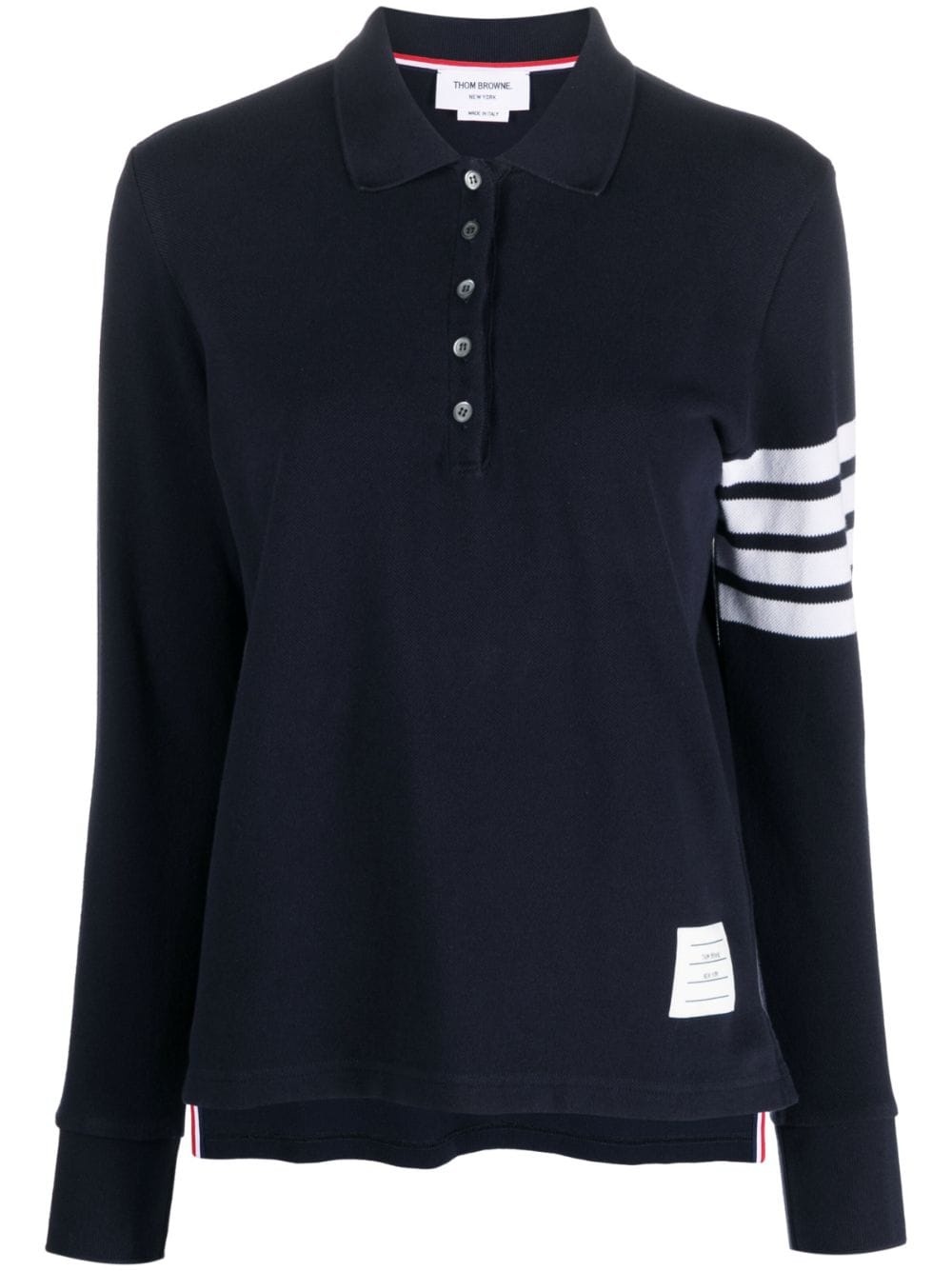 4-Bar long-sleeved polo shirt Crafted with a pique weave, this long-sleeved polo top from Thom Browne is decorated with the brand's signature 4-Bar stripe in white, constrasting against the piece's navy-blue background. Highlights - Navy blue - Signature 4-bar stripe - Polo collar - Front button placket - Long sleeves - Logo patch at the hem - Straight hem Made in Italy Composition Cotton 100% SIZE & FIT Model measurements Height 5 ft 10 in(1.77 m) Bust/Chest 35.03 in(89 cm) Hips 35.03 in(89 cm) Waist 23.62 in(60 cm)