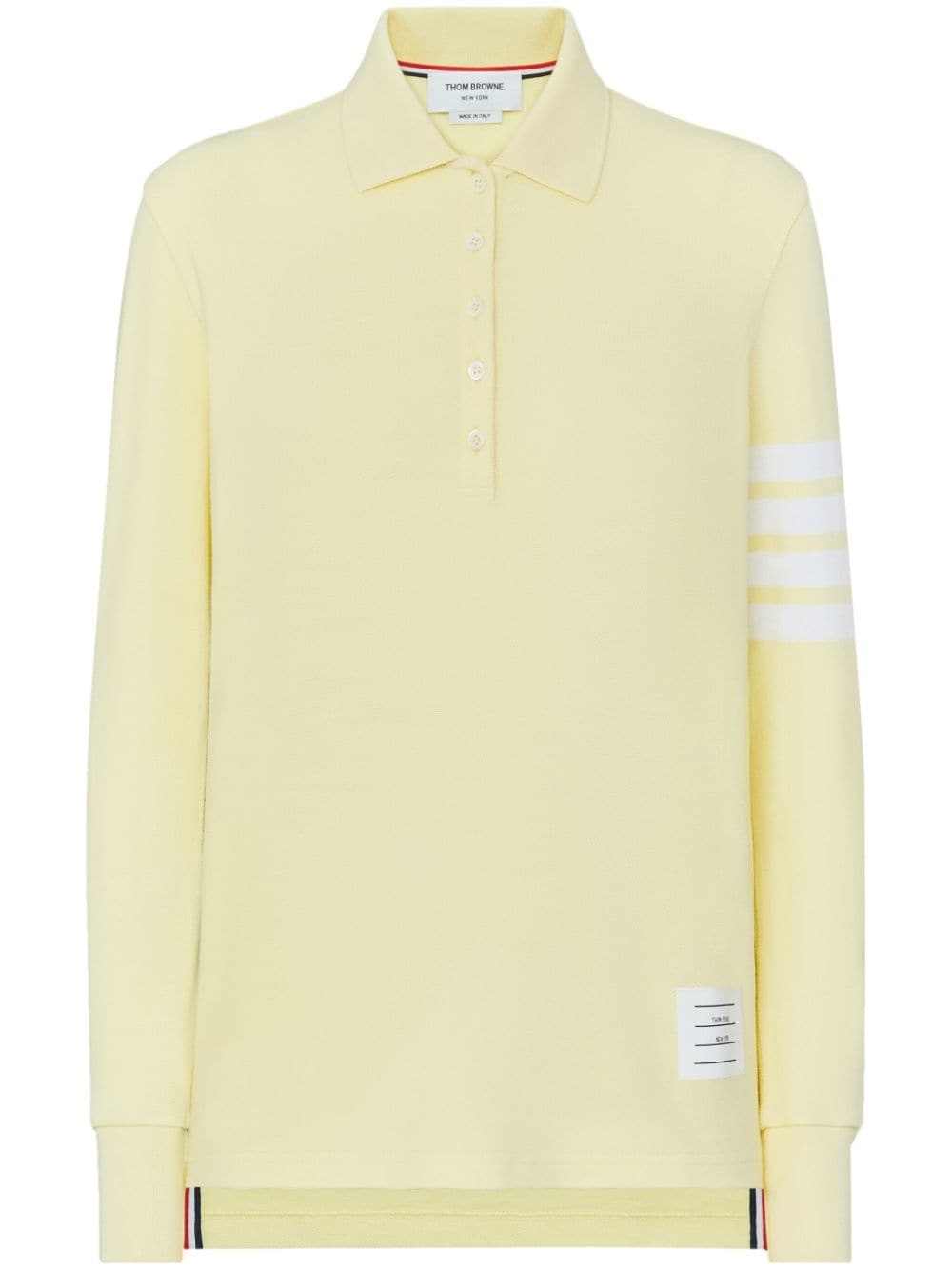 4-Bar long-sleeved polo top Crafted from soft cotton with a pique weave, this long-sleeved polo top from Thom Browne is decorated with the brand's signature 4-Bar stripe in white, constrasting against the piece's pastel yellow background. Made in Italy Composition Cotton 100%