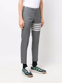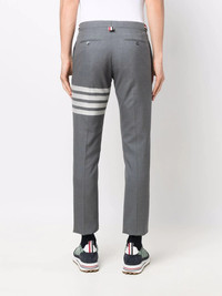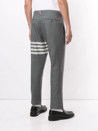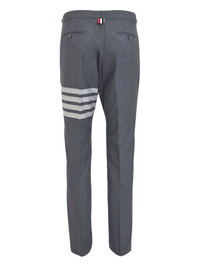 4-Bar low-rise trousers A classic, with a Thom Browne twist. Crafted from wool, in grey tone, these low-rise trousers are decorated with a signature grosgrain loop tab at the rear and the usual 4-Bar stripe on the leg. Highlights - Signature 4-bar stripe - Signature grosgrain loop tab - Low-rise - Concealed front fastening - Two side inset pockets - Two rear button-fastening pockets - Slim cut Made in Italy Composition Wool 100% SIZE & FIT FittingInformation This piece fits true to size. We recommend you get your regular size Cut for a slim fit Made with a mid-weight non-stretch fabric Washing instructions Dry Clean Only