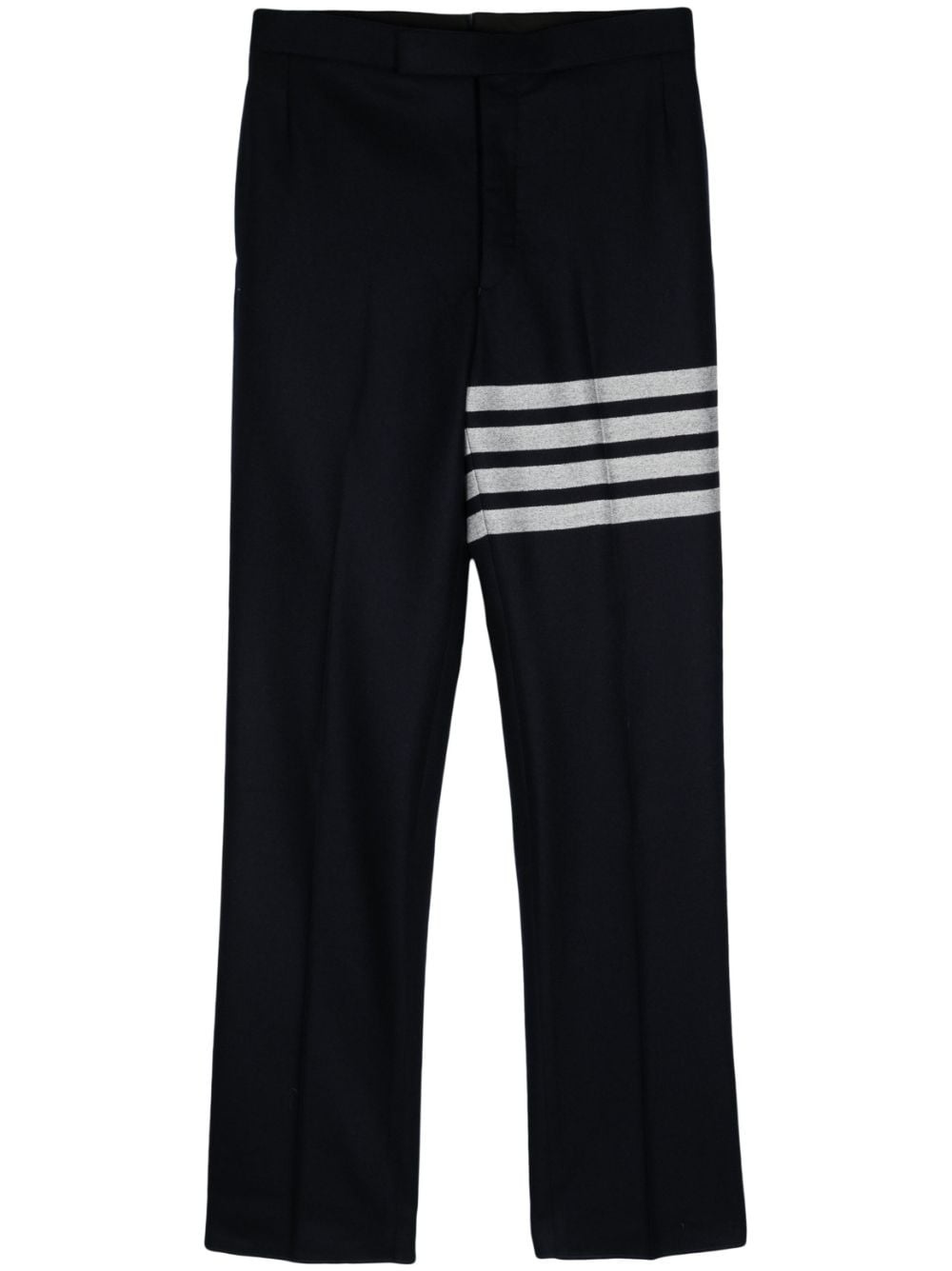 4-Bar low-waist tailored trousers Highlights - Navy blue - Wool-cashmere blend - Signature 4-bar stripe - Pressed crease - Two side inset pockets - Two rear button-fastening jetted pockets - Straight leg - Concealed front button, hook and zip fastening Made in Italy Composition Outer: Wool 95%, Cashmere 5% Lining: Cupro 100% SIZE & FIT FittingInformation Designed for a relaxed tapered leg, allowing a comfortable loose fit above the knee with a closer fit towards the calves Made from a midweight non-stretch fabric This piece fits true to size – take your usual size