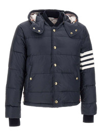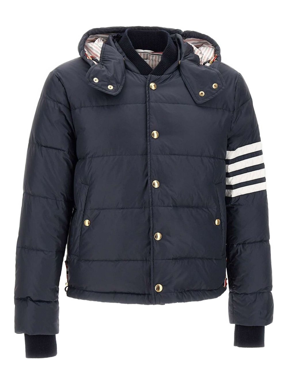 4-Bar bomber jacket Highlights - Navy - Wool and feather down - Navy blue - Front press-stud fastening - Detachable hood - Two side stud-fastening pockets - Ribbed cuffs Made in Italy Composition Lining: Feather Down 100%, Polyester 100% Outer: Polyamide 100%, Wool 100% SIZE & FIT Measurement CHEST 48.03 in(122 cm) SLEEVE LENGTH 37.79 in(96 cm) Shoulder Width 20.86 in(53 cm) WAIST 47.63 in(121 cm) FittingInformation Designed for a relaxed fit, this piece allows for comfort and movement when worn The internal drawstring at the hem allows for fitted preferences Made from a padded non-stretch fabric, giving it no natural elasticity This piece fits true to size – take your usual size Washing instructions Dry Clean Only
