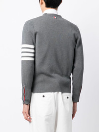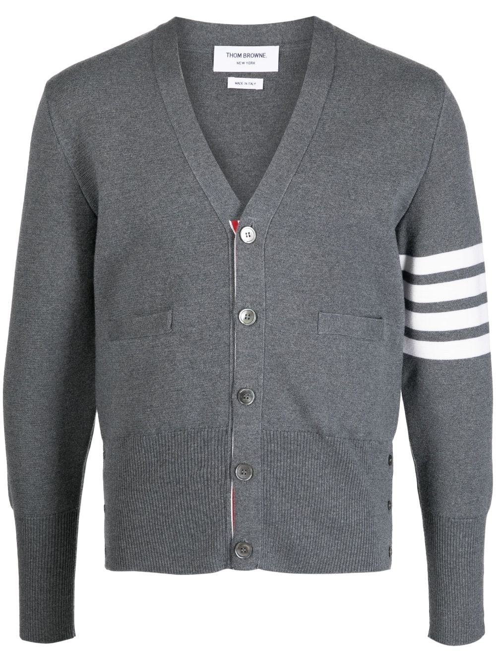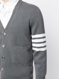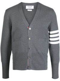 4-Bar Milano Stitch cardigan Spun in Italy from soft wool and woven into a delicate knitted finish, this cardigan features Thom Browne's signature 4-Bar stripe in a contrasting white hue at the sleeve for an instantly recognisable look. Highlights - Medium grey - Wool - Signature 4-bar stripe - V-neck - Front button fastening - Long sleeves - Straight hem Made in Italy Composition Wool 100% SIZE & FIT Model measurements Height 6 ft 2 in(1.87 m) Bust/Chest 34.25 in(87 cm) Hips 36.22 in(92 cm) Waist 29.52 in(75 cm) FittingInformation Designed for a slim fit, offering a comfortable fit that sits just away from the body Constructed with narrow shoulders Made with a midweight knit, this piece offers some stretch This piece fits true to size – if you would prefer a looser fit to layer, take one size up