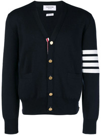 4-Bar Milano Stitch cardigan Suddenly feeling cosy? This navy-blue cotton 4-Bar Milano Stitch cardigan from Thom Browne had the exact same effect on us. We'll be wearing ours every weekend, as we will be docking our sailboat at some fancy port. Featuring a ribbed v-neck, a front button fastening, two front pockets, long sleeves, a ribbed hem and cuffs, a signature grosgrain loop tab at the rear and white 4-Bar detail to the left arm. Made in Italy Composition Cotton 100% SIZE & FIT Model measurements Height 6 ft 2 in(1.87 m) Bust/Chest 33.85 in(86 cm) Hips 35.82 in(91 cm) Waist 29.52 in(75 cm) Measurement CHEST 41.73 in(106 cm) SLEEVE LENGTH 26.37 in(67 cm) Shoulder Width 17.32 in(44 cm) Washing instructions Dry Clean Only