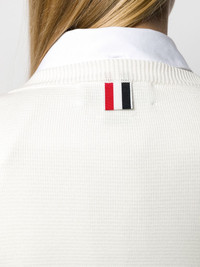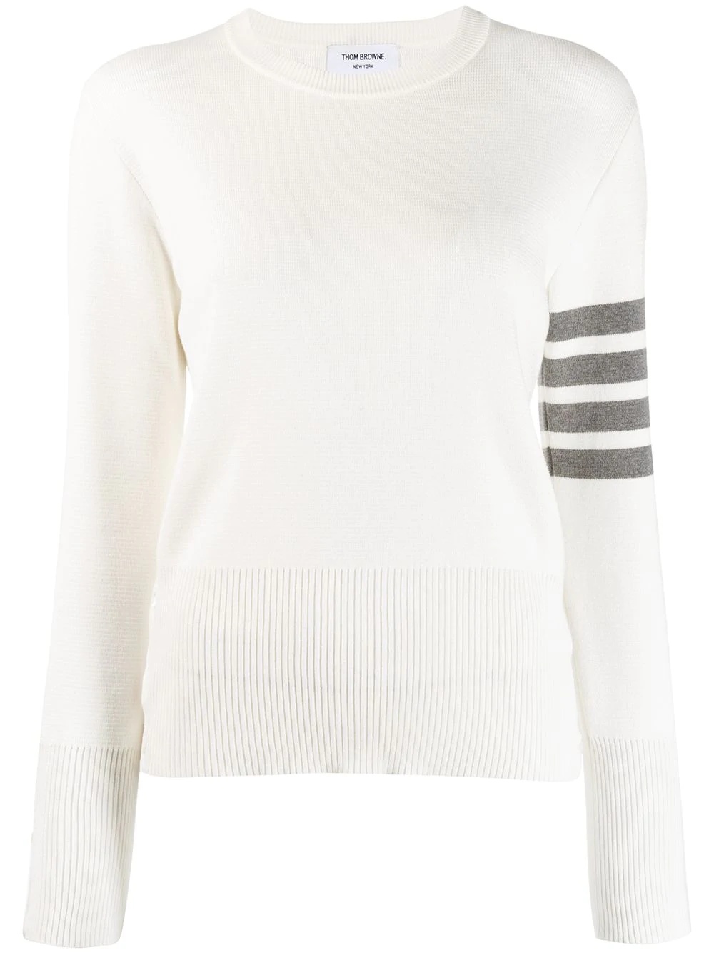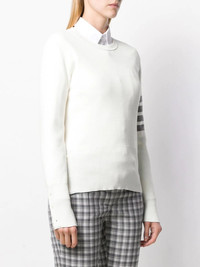 4-Bar Milano stitch jumper Sometimes, subtle is better. And by 'sometimes', we mean 'when it comes to this Thom Browne piece'. Soft tones and hidden RWB details are exactly what is needed here. Featuring a ribbed crew neck, dropped shoulders, long sleeves, a ribbed hem and cuffs, button cuffs, a signature grosgrain loop tab, a 4-Bar stripe and RWB details. Made in Italy Composition Cotton 100% SIZE & FIT Model measurements Height 5 ft 10 in(1.78 m) Bust/Chest 32.67 in(83 cm) Hips 35.82 in(91 cm) Waist 24.01 in(61 cm) Washing instructions Dry Clean Only