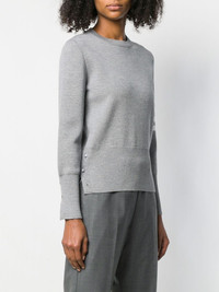 4-Bar Milano stitch jumper Keep things simple...but never boring. This 4-Bar stripe jumper from Thom Browne will be all you want to pull on when the weather turns chilly. Stay warm, look cool. Featuring a ribbed round neck, long sleeves, a ribbed hem and cuffs, a side button fastening, button cuffs, a signature grosgrain loop tab, a 4-Bar stripe and RWB details. Made in Italy Composition Merino 100% SIZE & FIT Model measurements Height 5 ft 11 in(1.8 m) Bust/Chest 31.49 in(80 cm) Hips 35.82 in(91 cm) Waist 24.8 in(63 cm) Washing instructions Dry Clean Only