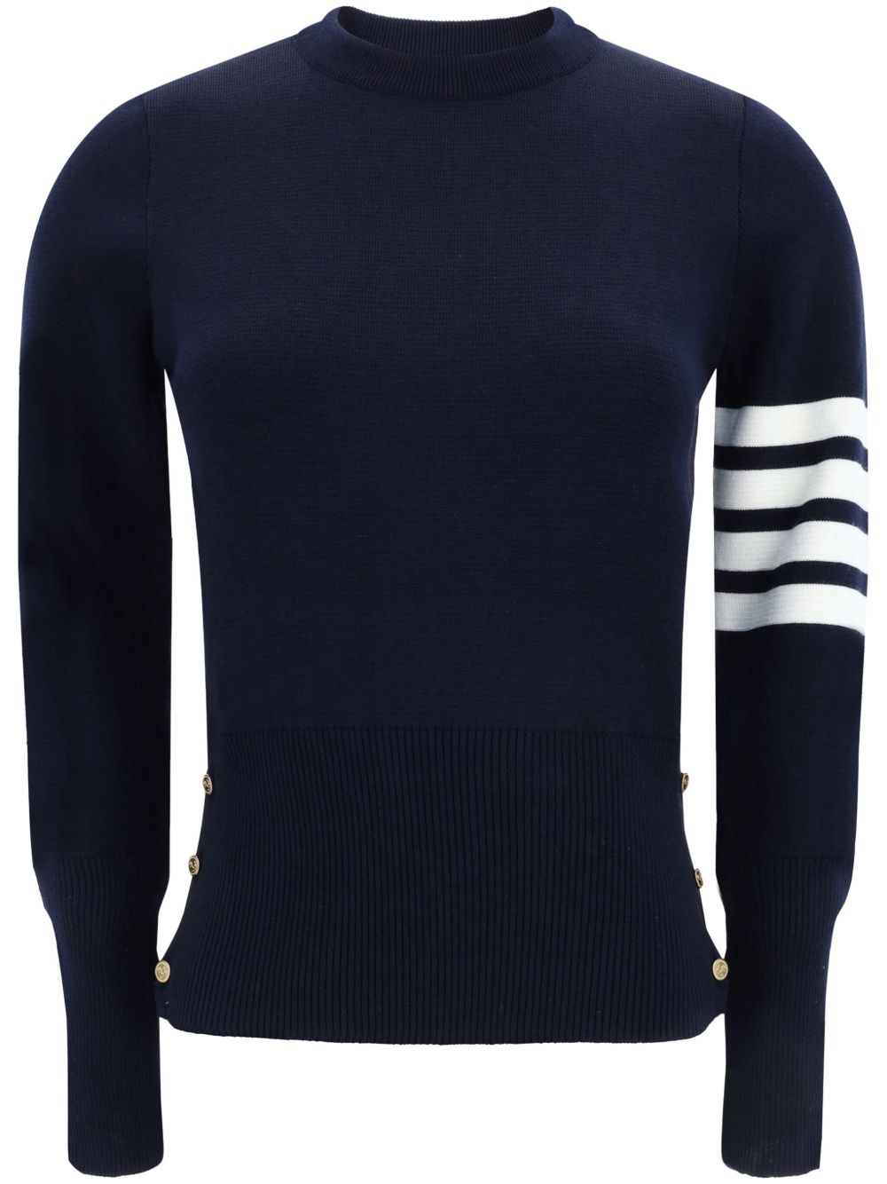 4-Bar Milano stitch jumper Is preppy style right up your street? Then you won't be able to stop thinking about this 4-Bar stripe jumper from Thom Browne. You two could be soul mates. Highlights - Navy/white - Merino - Crew neck - Signature grosgrain loop tab - Long sleeves - Rwb stripe - Buttoned cuffs - Side button fastening - Ribbed hem - Ribbed cuffs Made in Italy Composition Merino 100% Washing instructions Dry Clean Only