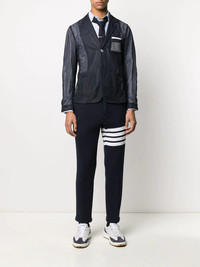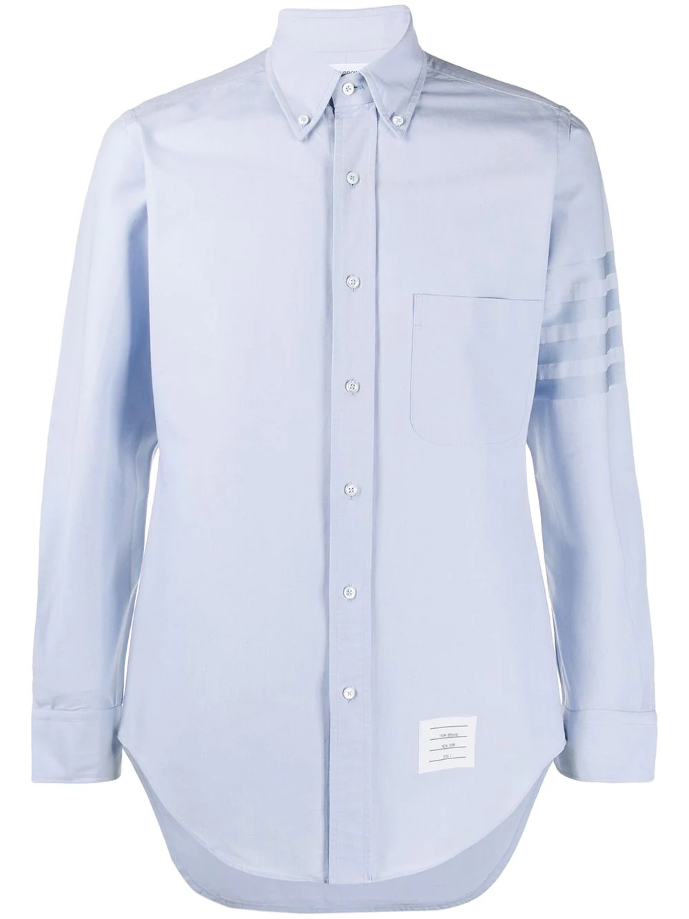 4-Bar Oxford shirt Four strikes and you're Thom Browne. Crafted from light blue cotton, this classic Oxford shirt showcases the iconic 4-Bar detailing to the sleeve. Featuring a button-down collar, a front button fastening, long sleeves, button cuffs, a chest pocket and a front logo patch. Made in Italy Composition Supima Cotton 100% SIZE & FIT Model measurements Height 6 ft 2 in(1.87 m) Bust/Chest 38.18 in(97 cm) Hips 36.61 in(93 cm) Waist 29.13 in(74 cm) FittingInformation This piece fits true to size. We recommend you get your regular size Cut for a slim fit Made with a mid-weight non-stretch fabric